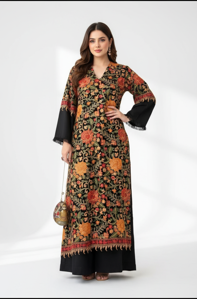 Experience timeless elegance with this Kashmiri Embroidered Long Dress, beautifully adorned with intricate floral threadwork in shades of Orange, rust, and green over a rich black base. The design showcases traditional craftsmanship with modern grace — perfect for festive gatherings, winter soirées, and cultural events.